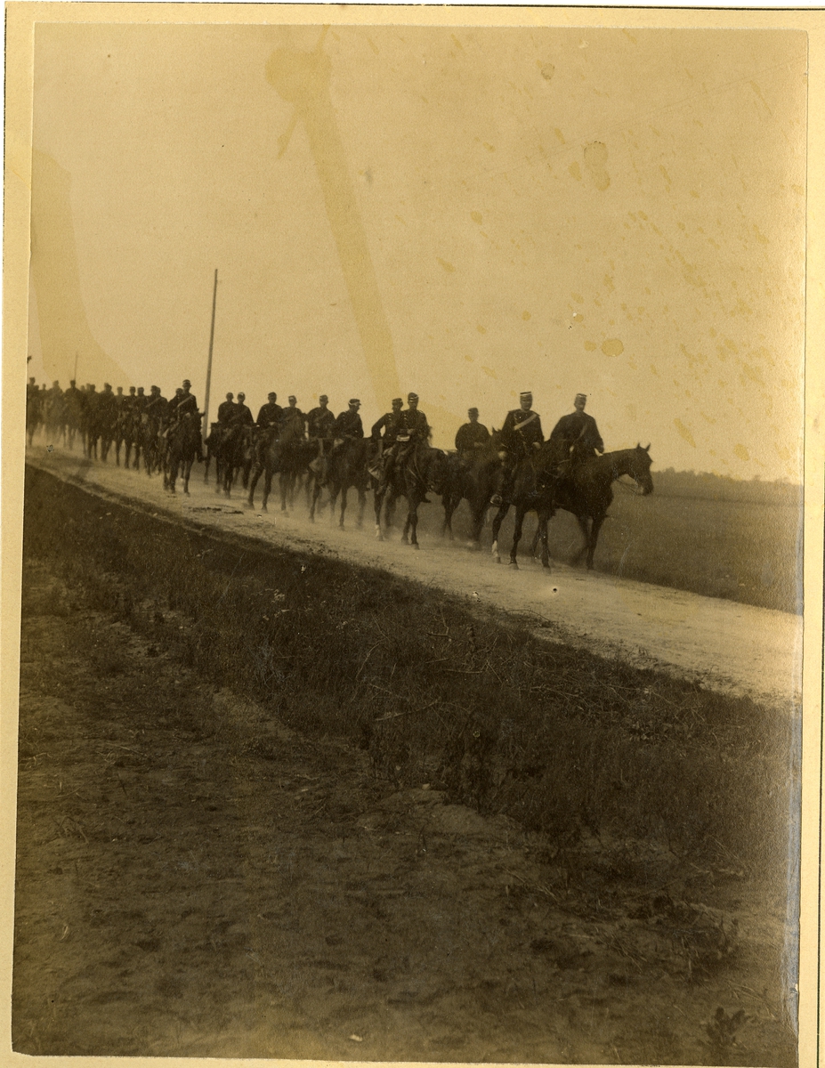 Titel: Delar av Skånska dragonregementet K 6 till häst på Ljungbyhed år 1900.