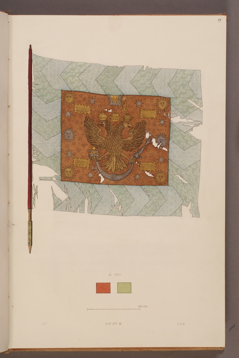 Titel: Avbildning i gouache föreställande fälttecken taget som trofé av svenska armén. Den avbildade fanan finns bevarad i Armémuseums samling, för mer information, se relaterade objekt.