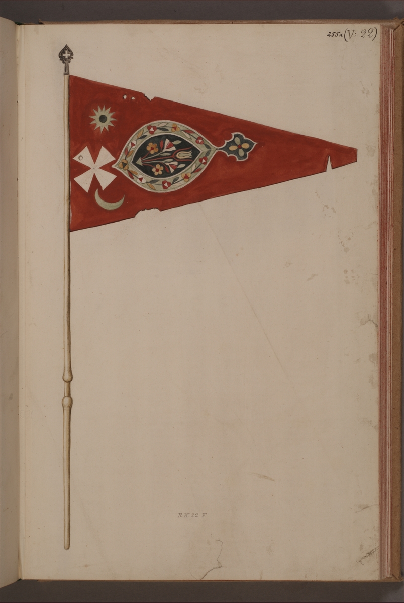 Titel: Avbildning i gouache föreställande fälttecken taget som trofé av svenska armén. Den avbildade vimpeln finns bevarad i Armémuseums samling, för mer information, se relaterade objekt.