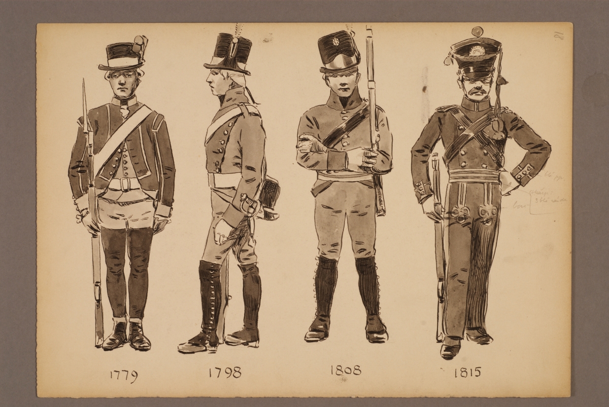 Plansch med uniform för Jämtlands fältjägare för åren 1779-1815, ritad av Einar von Strokirch.