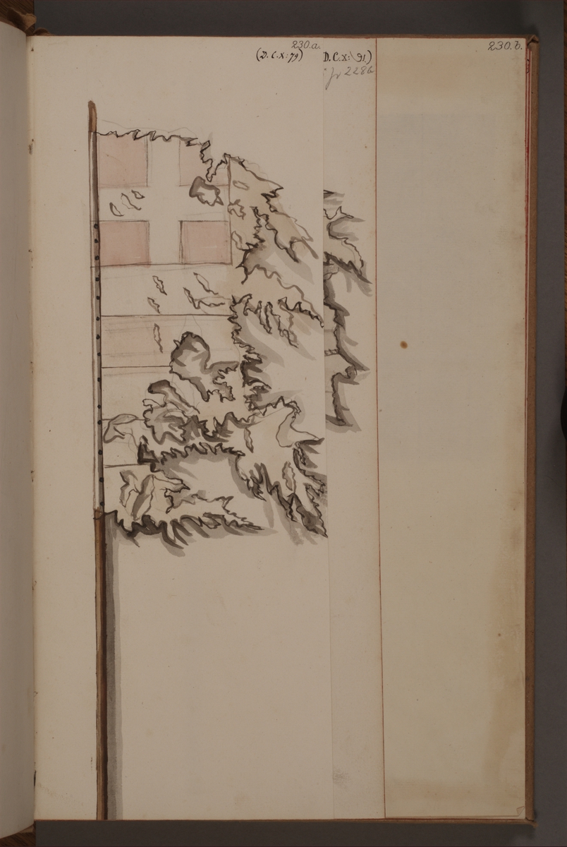 Avbildning i gouache föreställande fälttecken taget som trofé av svenska armén. Den avbildade fanan finns inte bevarad i Armémuseums samling.