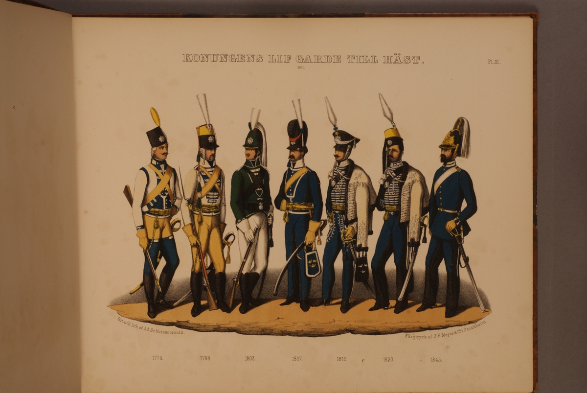 Plansch med uniform för Livgardet till häst för åren 1770-1845. Plansch i färgtryck efter original av Adolf Ulrik Schützercrantz. Ingår i planschsamlingen Svenska krigsmaktens fordna och närvarande munderingar.