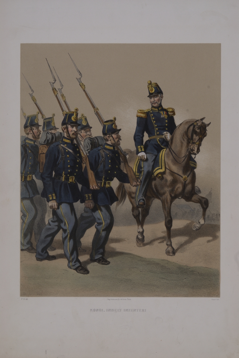 Plansch med uniform för Indelta infanteri. Plansch i färgtryck efter original av Fritz von Dardel. Ingår i planschsamlingen Den svenska och norske armeens uniformer, 1861-1863.