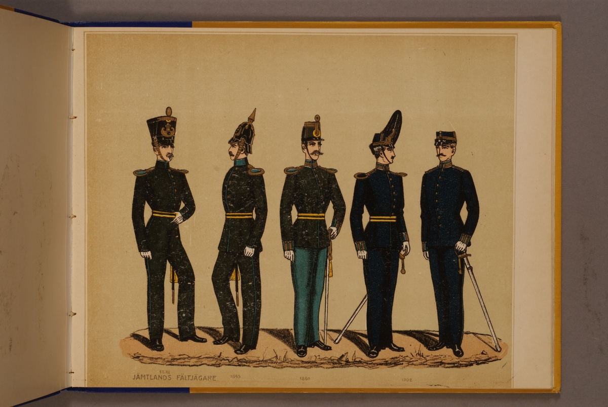 Plansch i färgtryck med uniform för Jämtlands fältjägare för åren 1838-1902. Ingår i planschsamlingen Svenska arméns och flottans officersmunderingar utgiven av P.B Eklund.