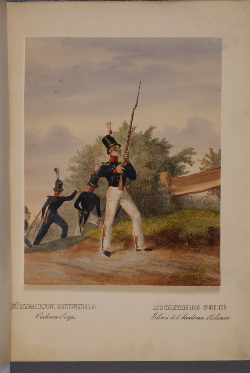 Plansch med uniform för Kadettkåren. Ingår i planschsamlingen Das europäische Heer in charakteristischen Gruppen: Scweden, utgiven av Eckert und Monten ca 1840.