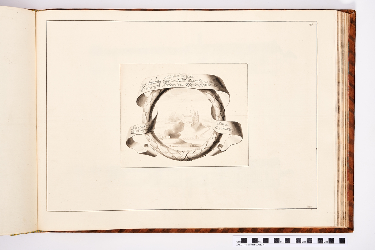 Kartusch till bokverk med avbildningar föreställande eldrör tagna som troféer av den svenska armén åren 1703-1706, utförda av syskonen Anna Maria och Philip Jakob Thelott. Avser troféer tagna med fästningen Bertzen den 15 september 1704 under general Adam Leijonhufvuds (Lewenhaupt) anförande.
