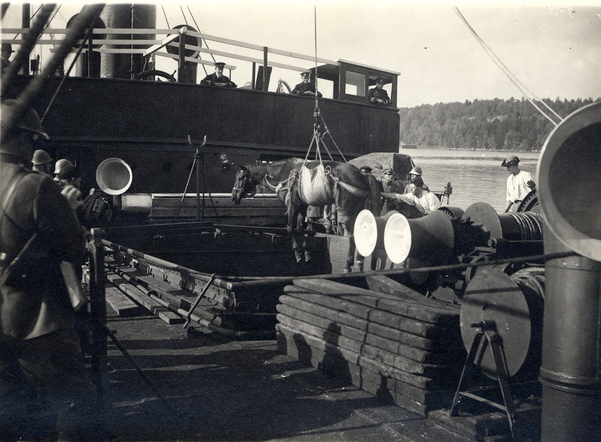 Häst vinschas ombord på ett fartyg och ner i lastrummet. Soldater ur Vaxholms grenadjärregemente I 26 ser på vid sidan om.
