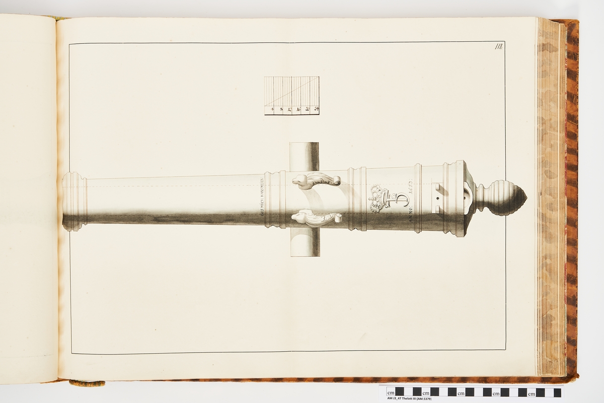 Avbildning föreställande dansk trofé med Frederik III:s vapen. Ingår i volym med avbildade äldre svenska eldrör förvarade på fästningar samt eldrör erövrade åren 1598-1679.