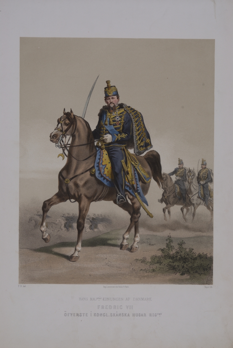 Plansch med uniform för Skånska husarregementet. Fredrik VII av Danmark till häst. Plansch i färgtryck efter original av Fritz von Dardel. Ingår i planschsamlingen Den svenska och norske armeens uniformer, 1861-1863.