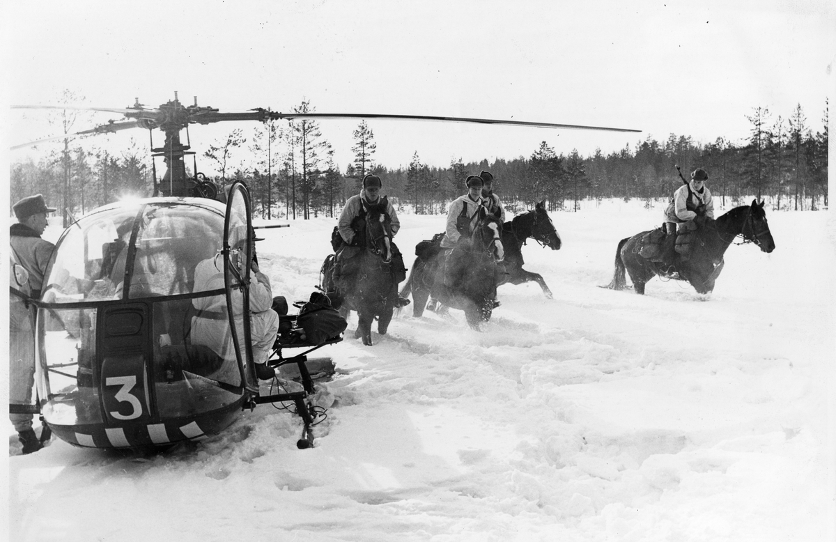Titel: Fyra kavallerister till häst i djup snö passerar en helikopter alouette som landat.