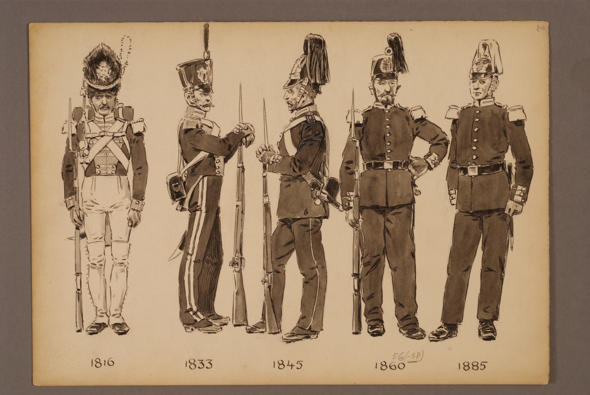 Plansch med uniform för Svea livgarde för åren 1816-1885, ritad av Einar von Strokirch.