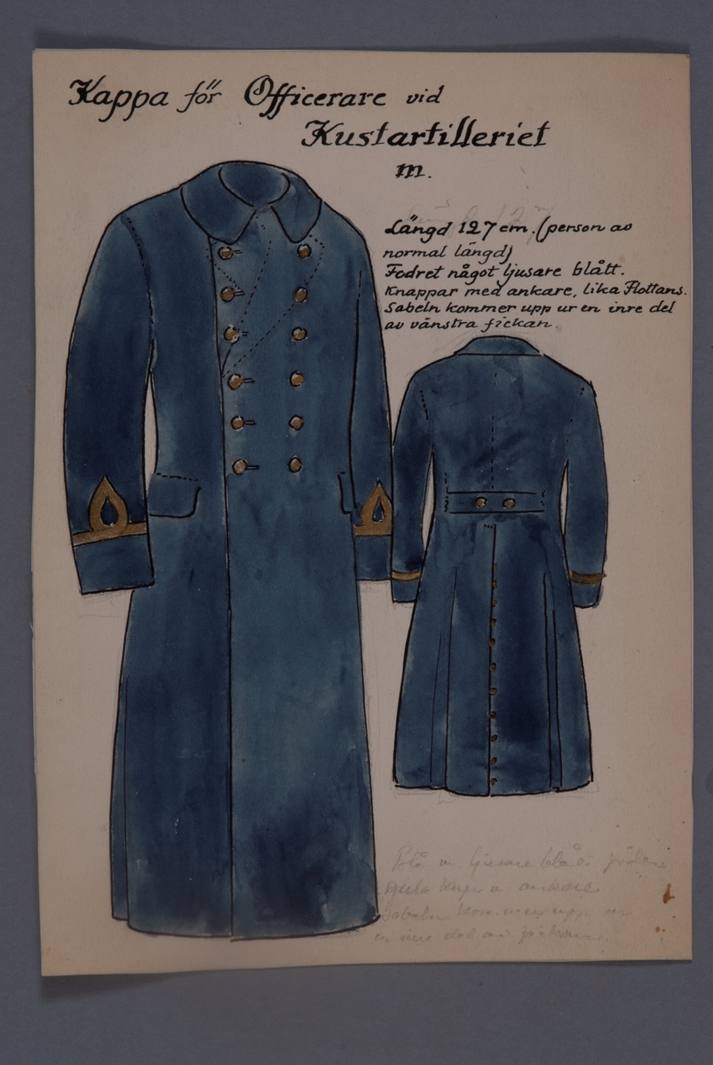 Uniformsteckning i original av Einar von Strokirch, kappa för officer vid Kustartilleriet.