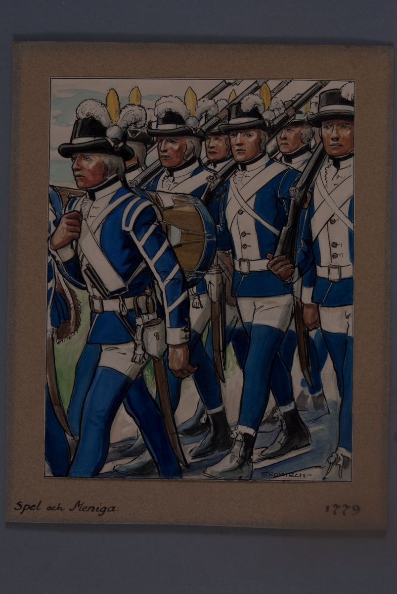 Plansch i original med uniform för spel och meniga för år 1779, ritad av Einar von Strokirch.