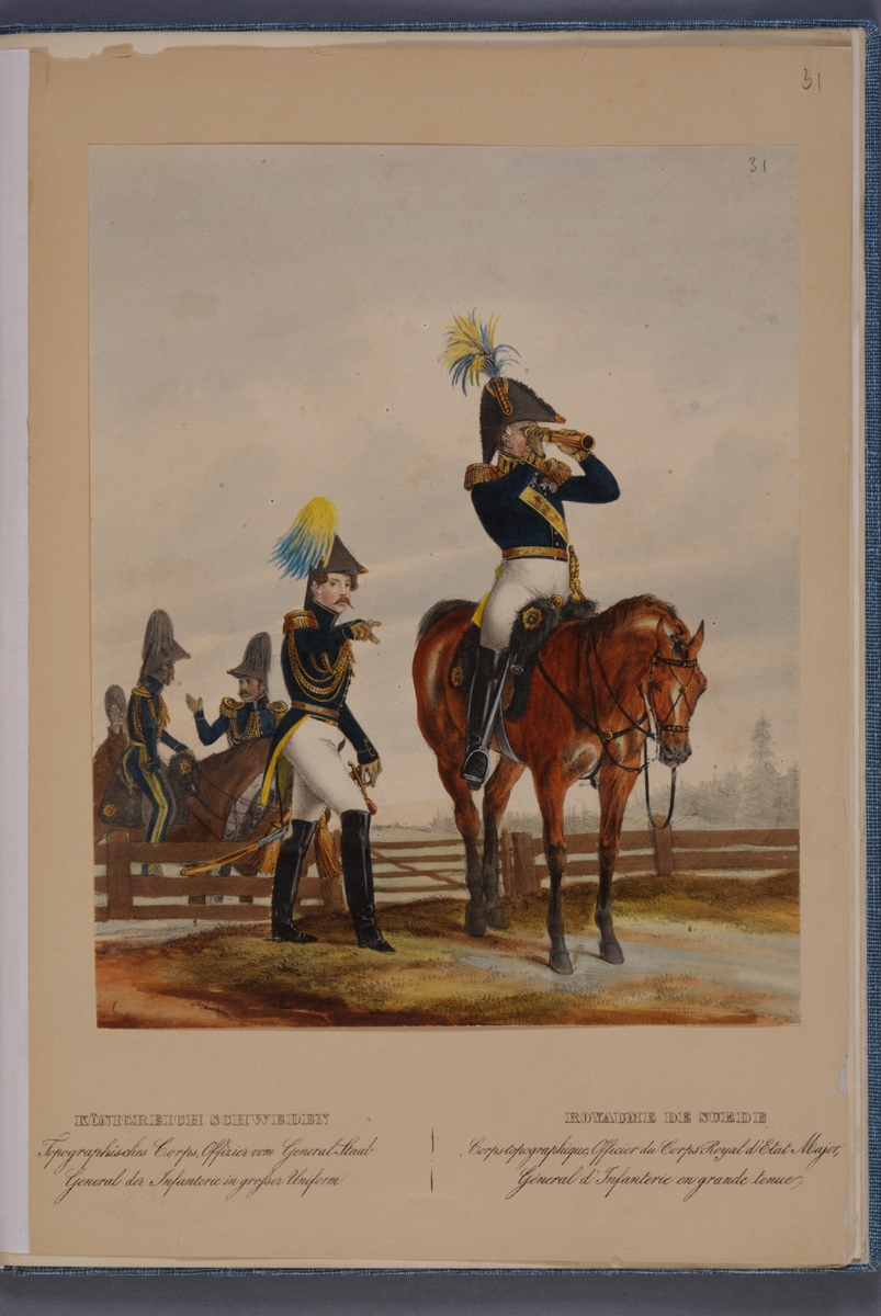 Plansch med uniform för Topografiska kåren, officer vid Generalstaben, och general i paraduniform vid infanteriet. Ingår i planschsamlingen Das europäische Heer in charakteristischen Gruppen: Scweden, utgiven av Eckert und Monten ca 1840.