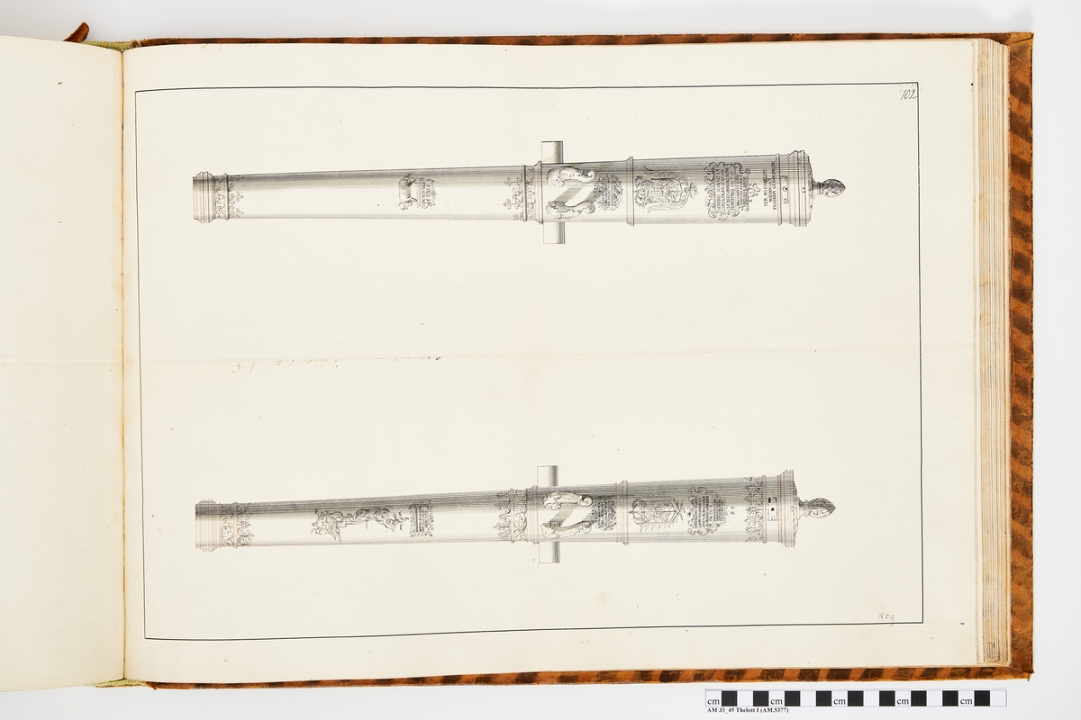 Avbildning föreställande eldrör tagna som troféer av den svenska armén i slaget vid Kliszów den 9 juli 1702. Ingår i volym med avbildade kanontroféer tagna åren 1700-1702.