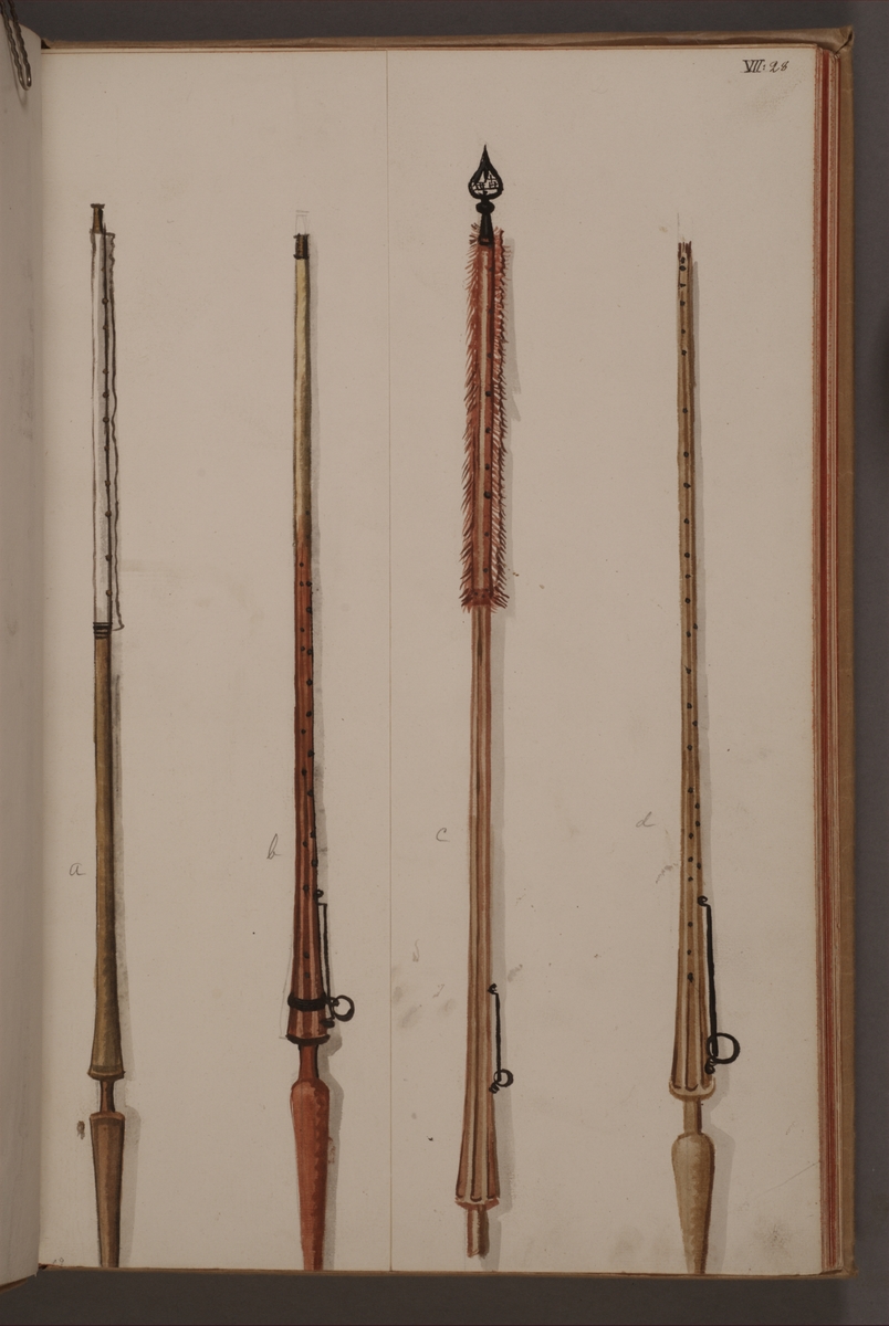 Avbildning i gouache föreställande standarstänger tagna som troféer av svenska armén. Stången längst till vänster och stången näst längst till höger i bild finns bevarade i Armémuseums samling, för mer information, se relaterade objekt.