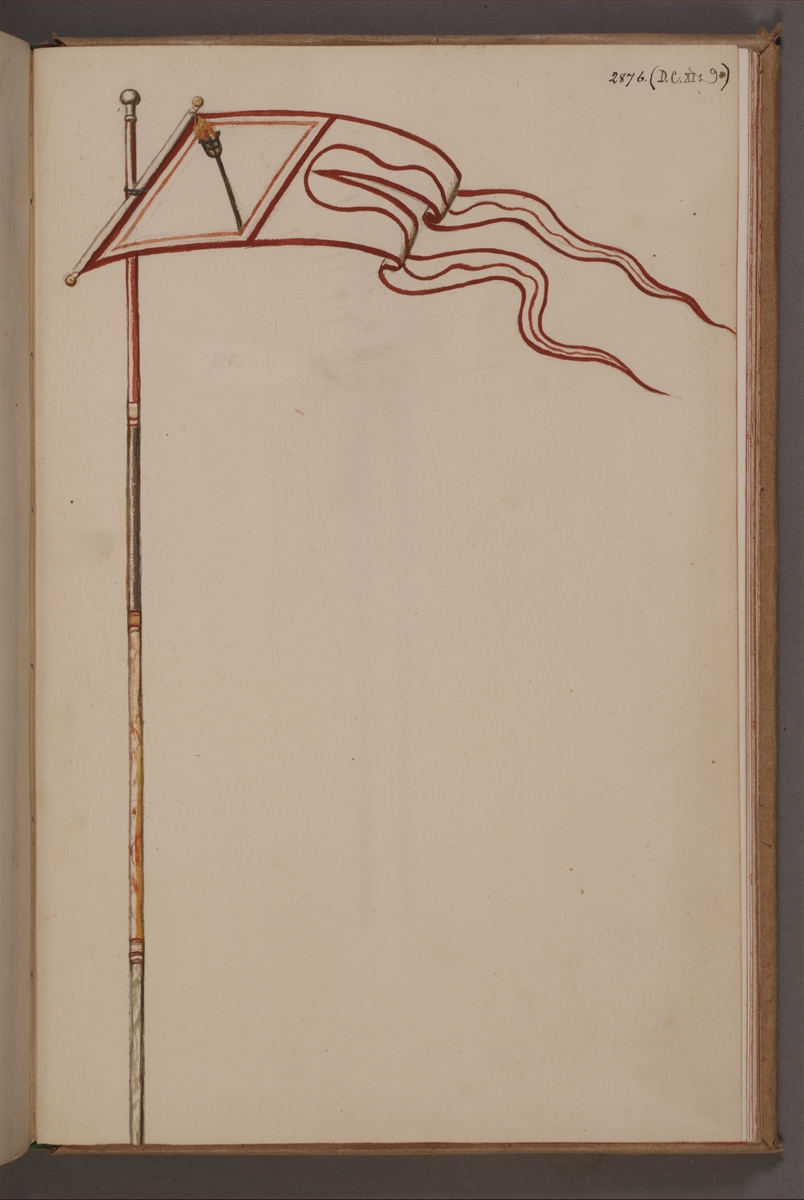 Titel: Avbildning i gouache föreställande fälttecken taget som trofé av svenska armén. Den avbildade vimpeln finns bevarad i Armémuseums samling, för mer information, se relaterade objekt.