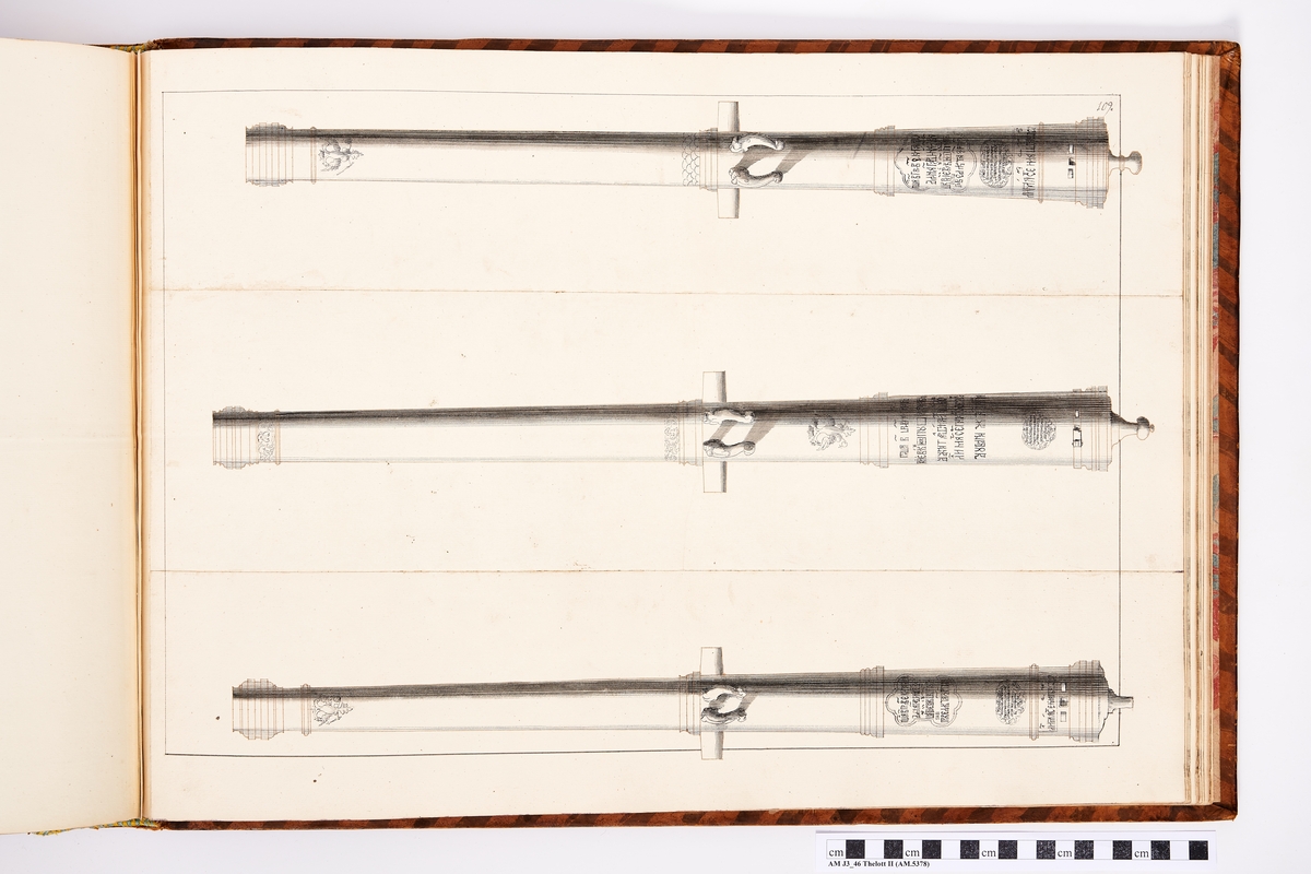 Avbildning föreställande eldrör tagna som troféer av den svenska armén vid Thulendorf den 29 november 1704. Ingår i volym med avbildade kanontroféer tagna åren 1703-1706.