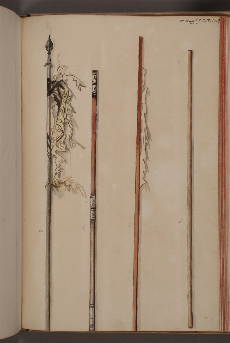 Avbildning i gouache föreställande fanstänger tagna som troféer av svenska armén. Stången näst längst till vänster i bild finns bevarad i Armémuseums samling, för mer information, se relaterade objekt.