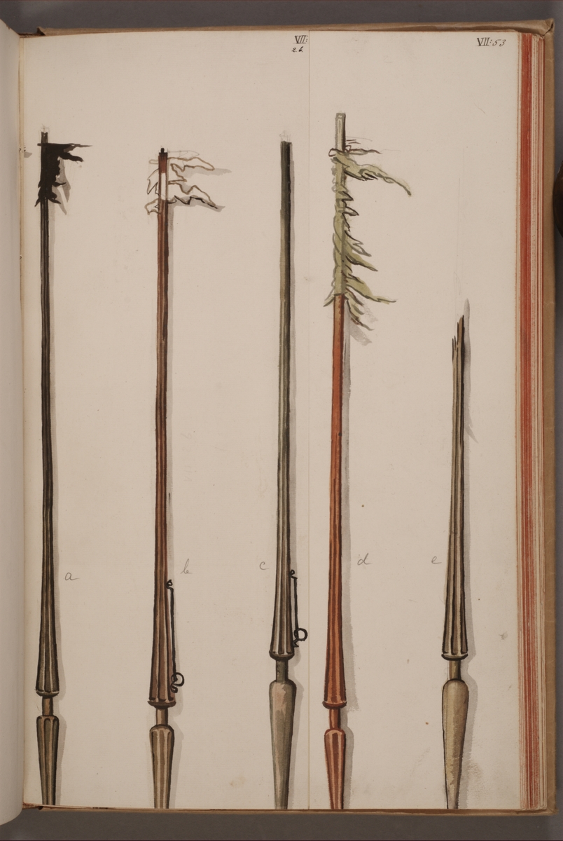 Avbildning i gouache föreställande standarstänger tagna som troféer av svenska armén. Stängerna näst längst till höger och näst längst till vänster i bild finns bevarade i Armémuseums samling, för mer information, se relaterade objekt.