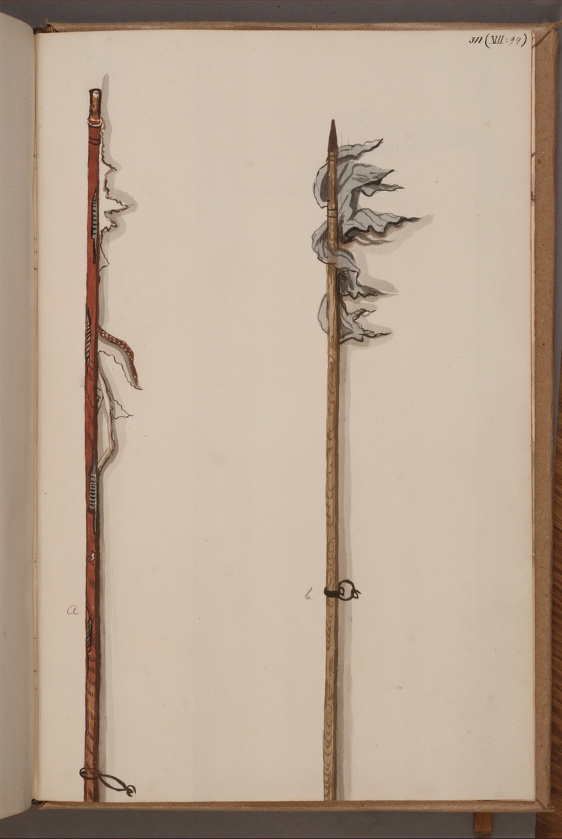 Avbildning i gouache föreställande fanstänger tagna som troféer av svenska armén. De avbildade stängerna finns bevarade i Armémuseums samling, för mer information, se relaterade objekt.