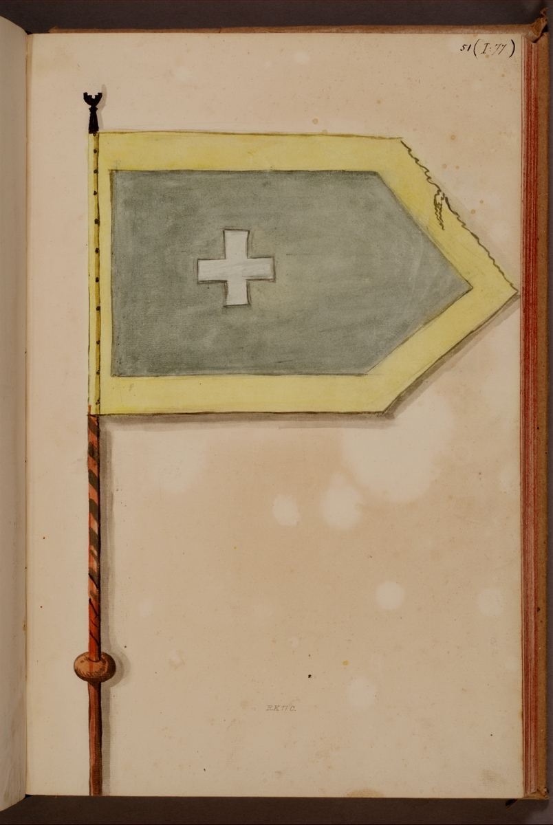 Titel: Avbildning i gouache föreställande fälttecken taget som trofé av svenska armén. Den avbildade fanan finns bevarad i Armémuseums samling, för mer information, se relaterade objekt.
