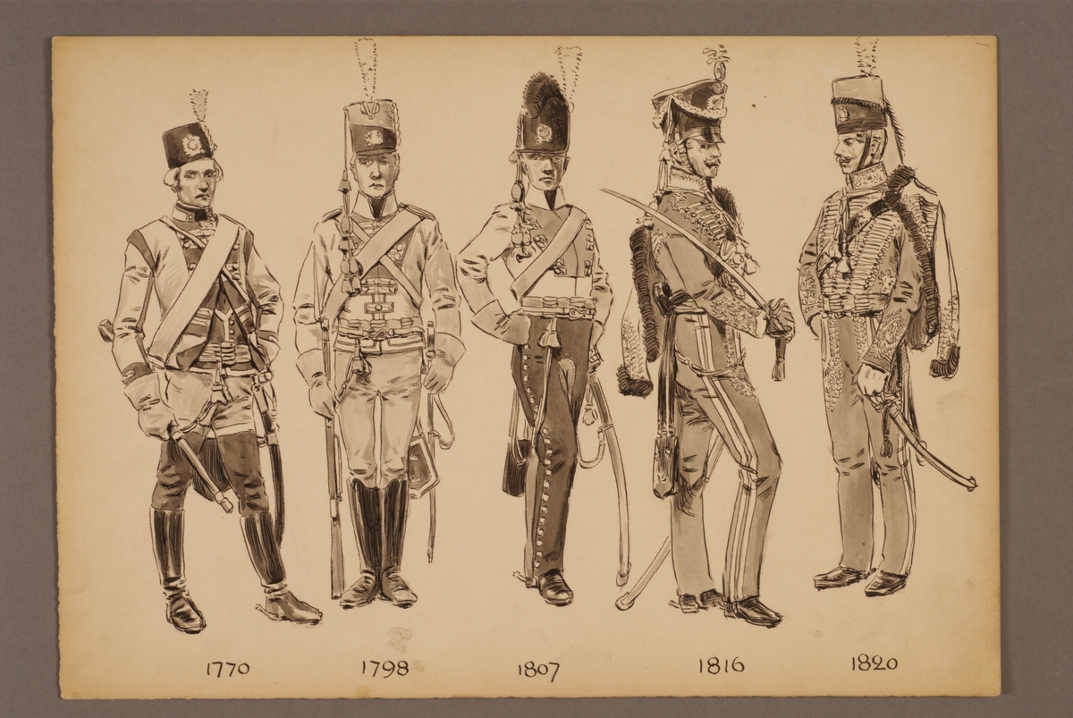 Plansch med uniform för Livgardet till häst för åren 1770-1820, ritad av Einar von Strokirch.
