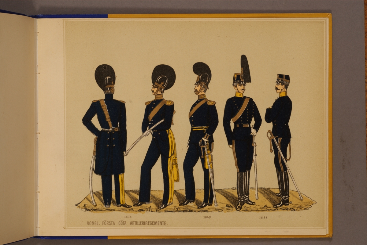 Plansch i färgtryck med uniform för Första Göta artilleriregemente för åren 1816-1888. Ingår i planschsamlingen Svenska arméns och flottans officersmunderingar utgiven av P.B Eklund.