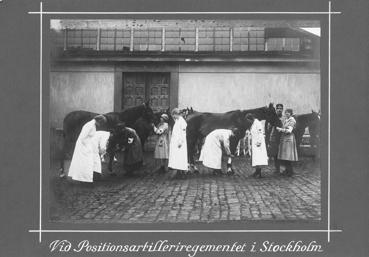 Positionsartilleriregemente A9 i Stockholm, hästar pysslas om utanför stall.