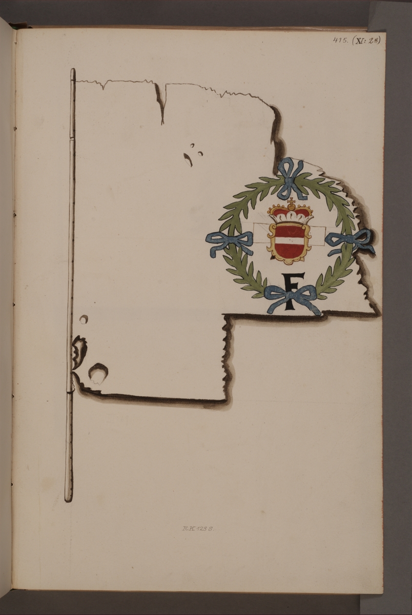 Avbildning i gouache föreställande fana tagen som trofé av svenska armén. Den avbildade fanan finns bevarad i Armémuseums samling, för mer information, se relaterade objekt.