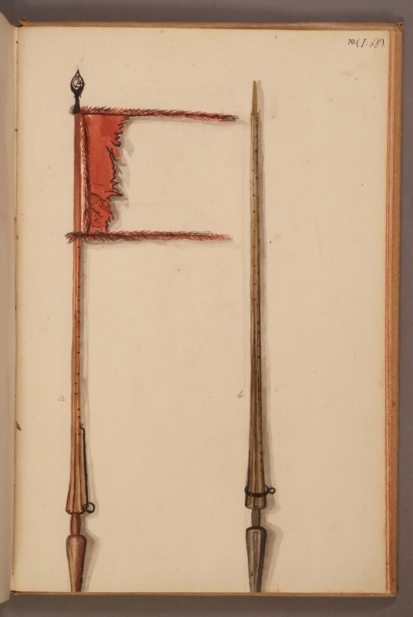 Avbildning i gouache föreställande fälttecken tagna som troféer av svenska armén. Standaret till vänster i bild finns bevarat i Armémuseums samling, för mer information, se relaterade objekt.