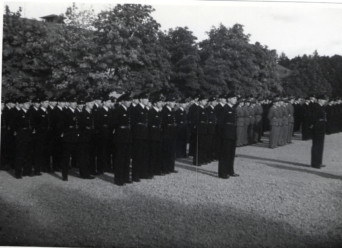 Avlämning till chefen på kaserngården vid Arméns underofficersskola (Försvarets läroverk) i Uppsala 1949, flygvapenkompaniet i förgrunden.