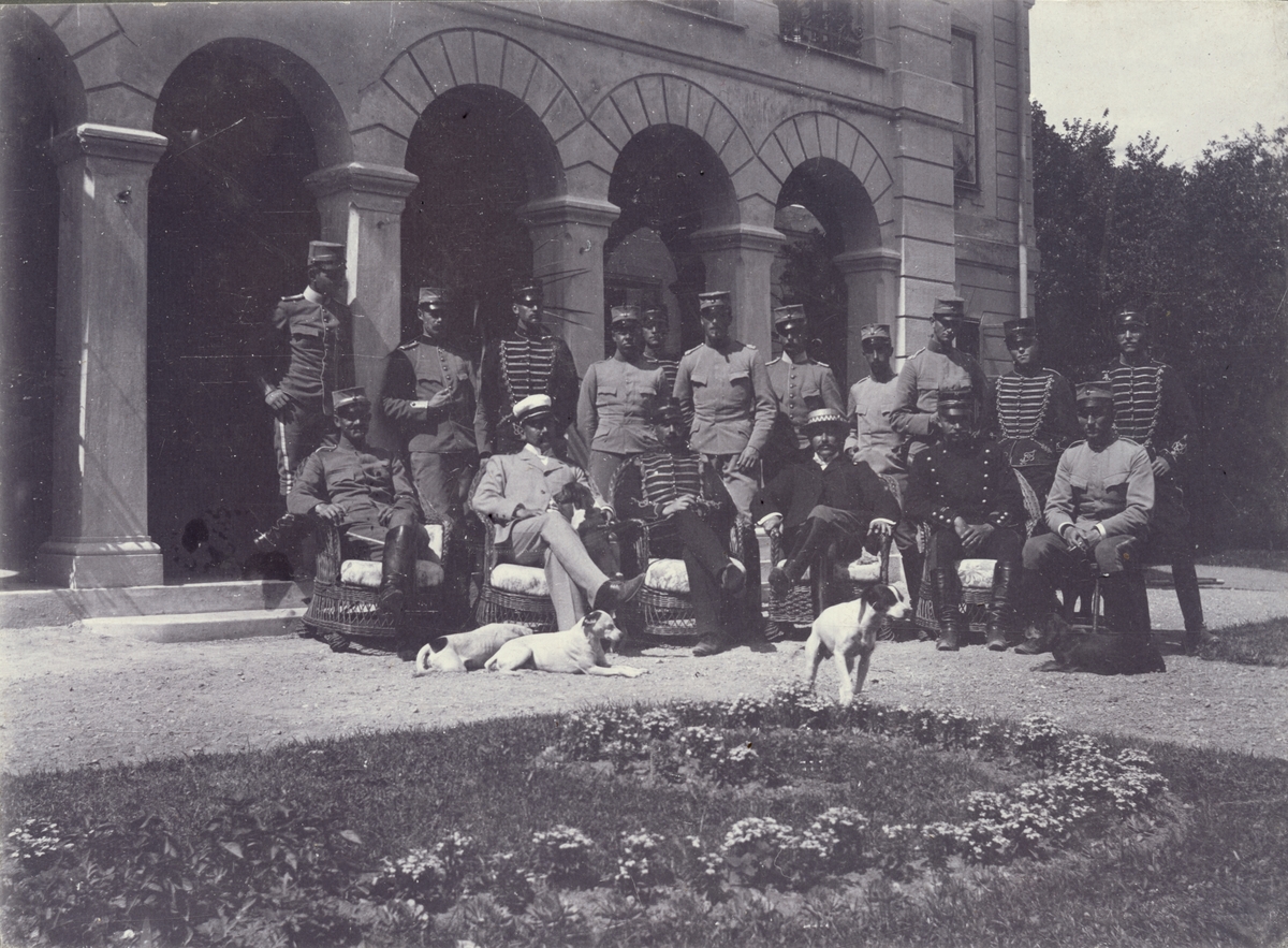 Titel: Gruppbild med civila och soldater till häst från Livregementets husarkår.