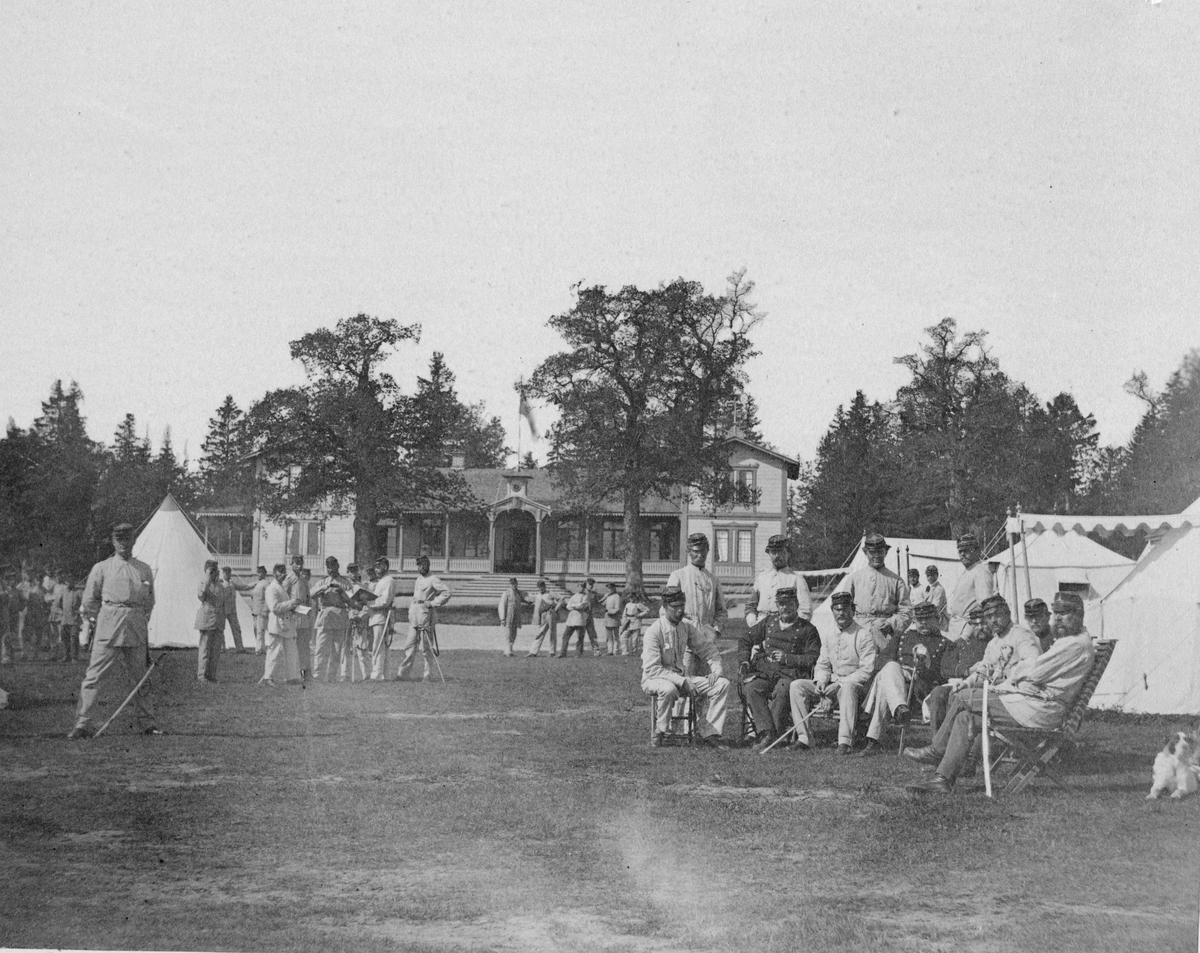 Titel: Soldater ur Västmanlands regemente I 18 samlade utanför tältläger vid Utnäs Löt vid tiden då Henrik Falkenberg var sekundchef.