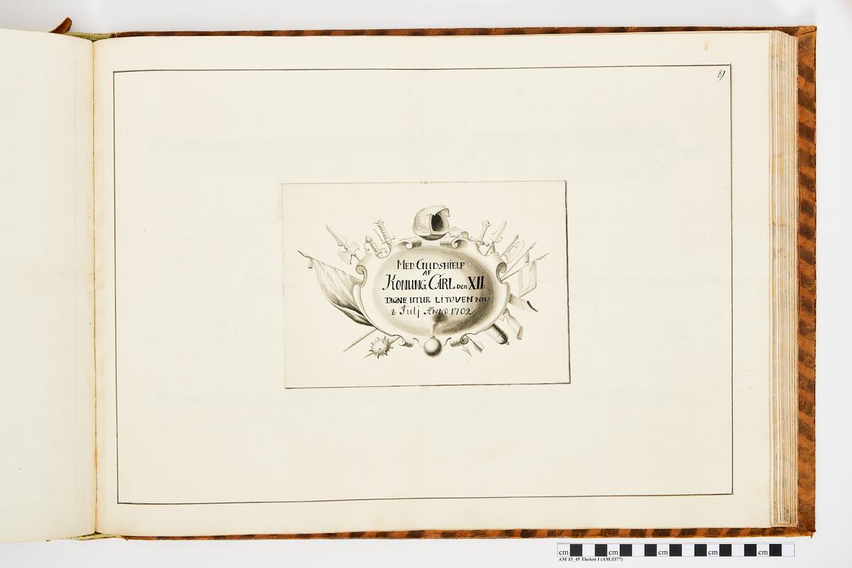 Kartusch till bokverk med avbildningar föreställande eldrör tagna som troféer av den svenska armén åren 1700-1702, utförda av syskonen Anna Maria och Philip Jakob Thelott. Avser troféer tagna utur Litauen den 8 juli 1702.