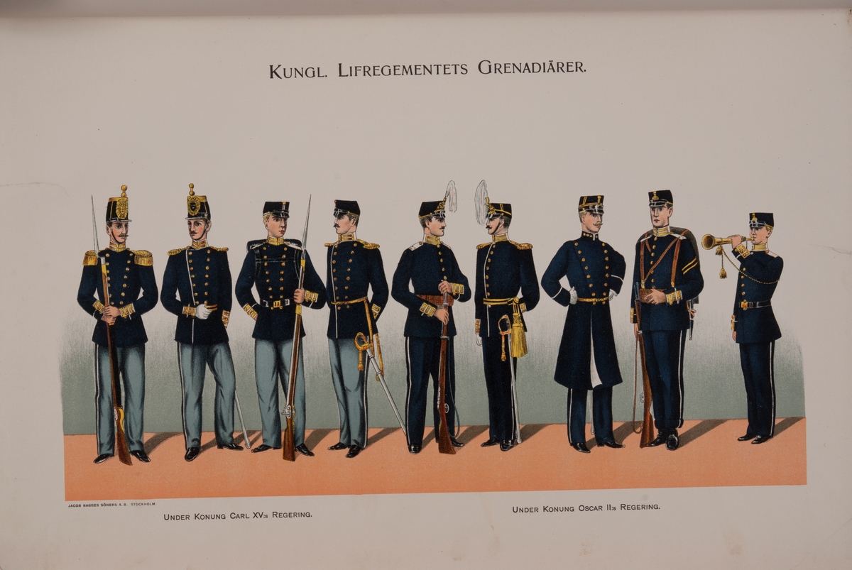 Plansch med uniform för Livregementets grenadjärer under Karl XV regering och Oscar II regering. Ingår i boken Svenska krigsmakten under konungarna Carl XIV Johan, Oscar I, Karl XV, Oscar II, utgiven av P.B. Eklund.