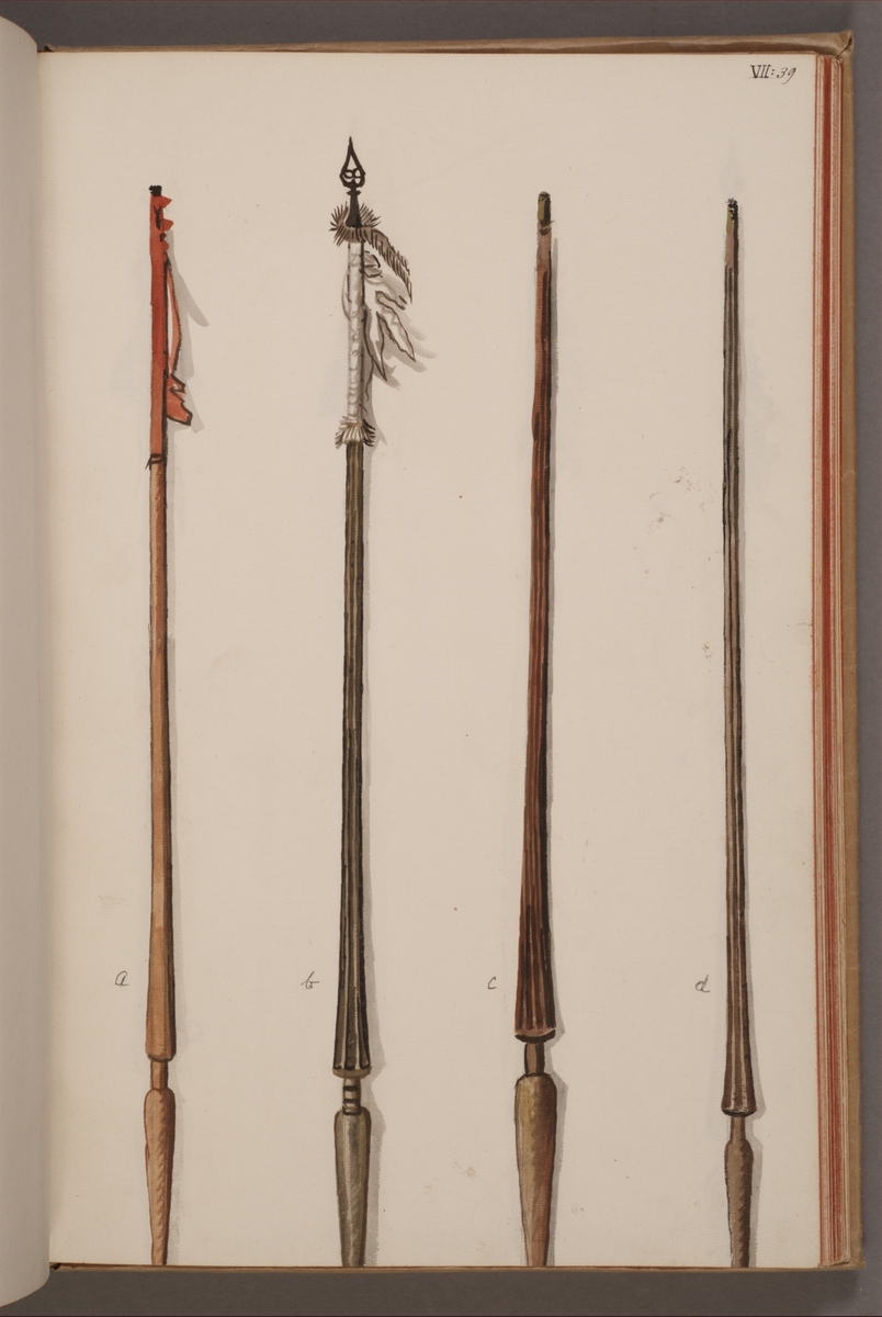 Avbildning i gouache föreställande standarstänger tagna som troféer av svenska armén. Ingen av stängerna finns bevarade i Armémuseums samling.