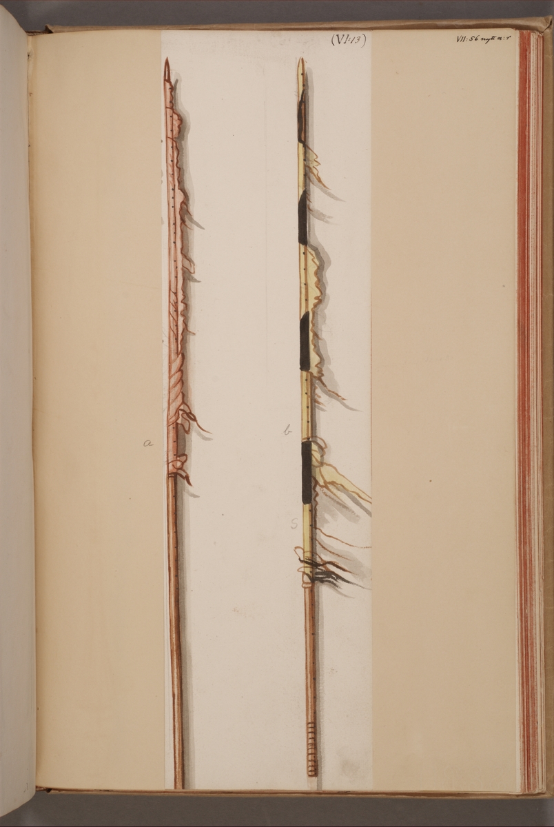 Avbildning i gouache föreställande fanstänger tagna som troféer av svenska armén. Stången längst till vänster i bild finns bevarad i Armémuseums samling, för mer information, se relaterade objekt.