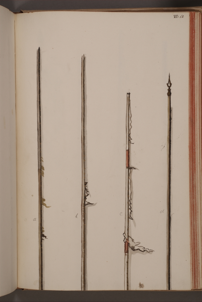 Avbildning i gouache föreställande fanstänger tagna som troféer av svenska armén. De avbildade stängerna finns inte bevarade i Armémuseums samling.