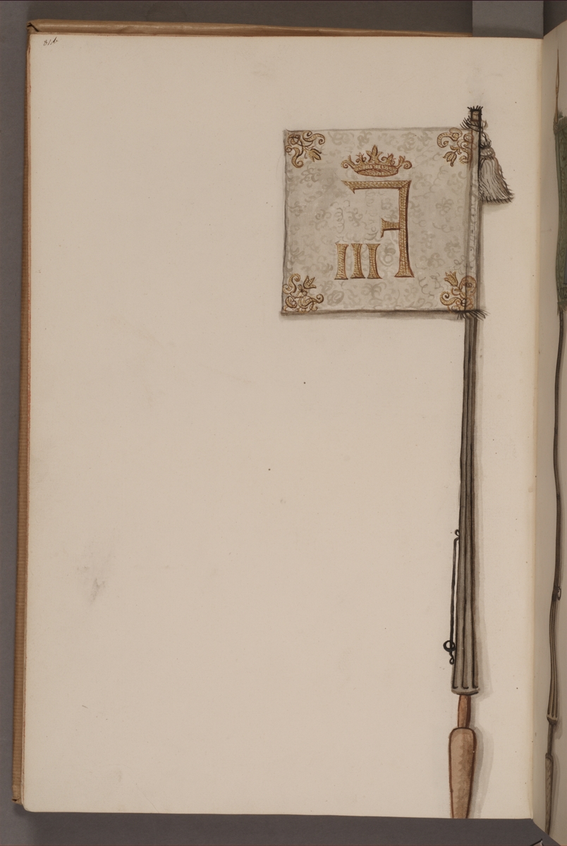 Titel: Avbildning i gouache föreställande fälttecken taget som trofé av svenska armén. Den avbildade fanan finns delvis bevarad i Armémuseums samling, för mer information, se relaterade objekt.