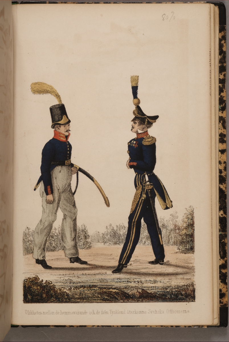 Olikheten mellan de hemmavarande och de från Tyskland återkomna svenska officerarna. Uniformsteckning av Carl Johan Ljunggren tryckt i boken Minnesanteckningar under 1813 och 1814 års kampanjer uti Tyskland och Norge, utgiven 1855.
