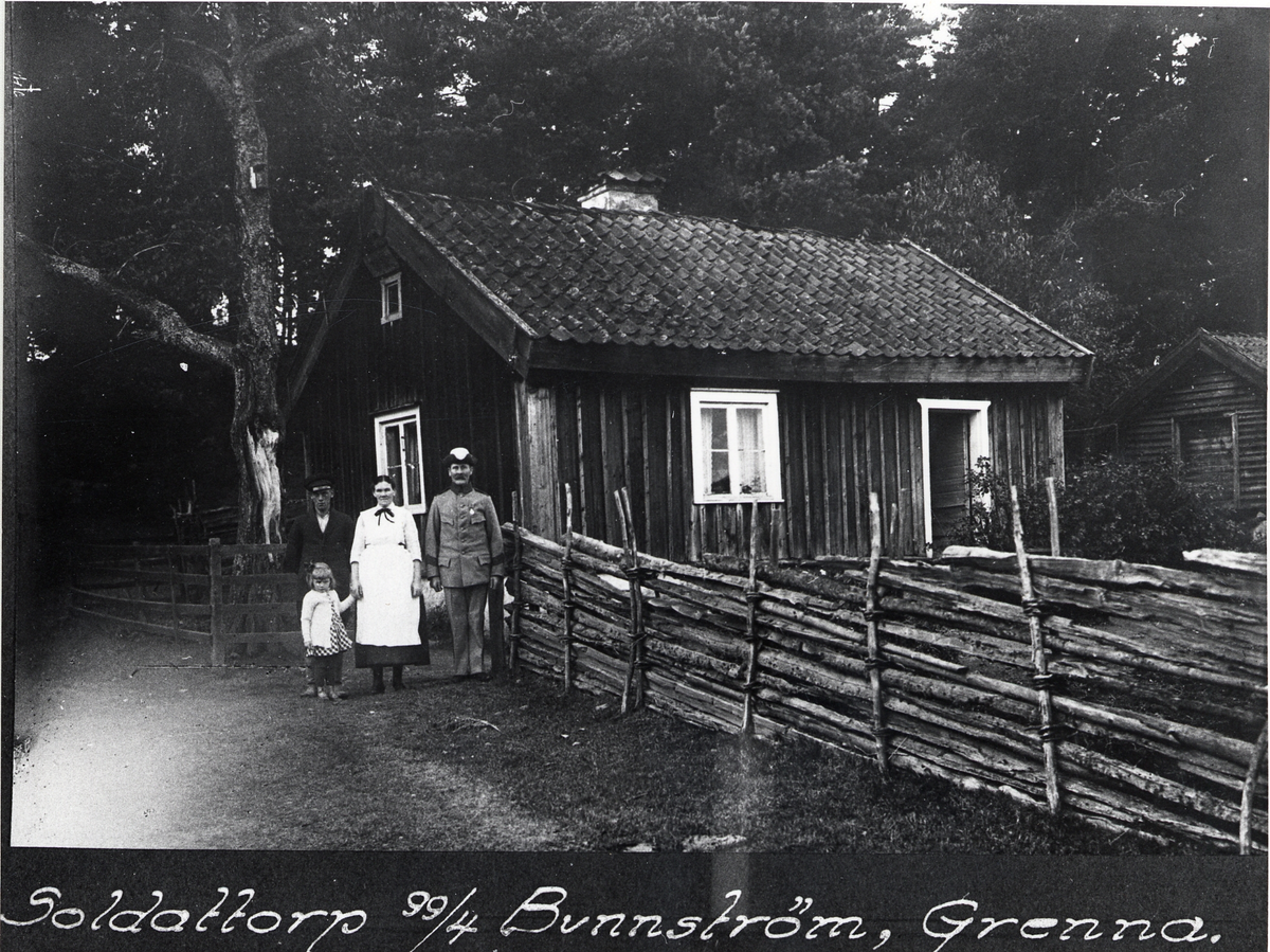 Soldattorp 99/4 Bunnström Gränna, soldat i uniform m/1910 med familj på vägen utanför stugan.