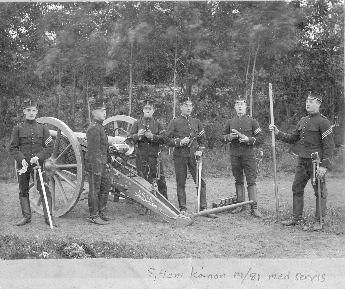 Artillerister ur Andra Svea artilleriregemente A 5 upställda brevid en 8,4 cm kanon m/1881 med servis. Soldaterna är iförda uniform och bär sabel m/1889.