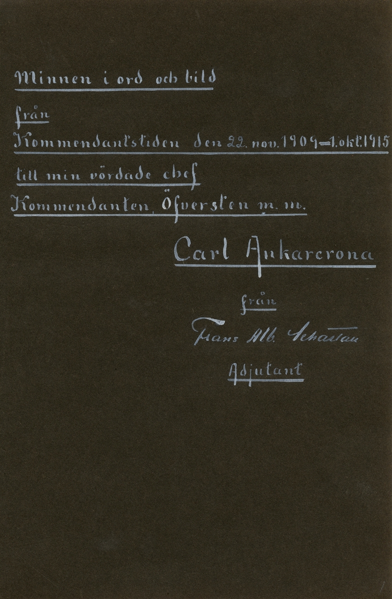 Minnen i ord och bild från kommendantstiden den 22. november 1909 1. oktober 1915 till min vördade chef Kommendanten, öfversten m. m. Carl Ankarcrona från Frans Alb. Schartau, adjutant.
