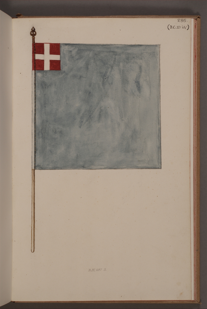 Titel: Avbildning i gouache föreställande fälttecken taget som trofé av svenska armén. Den avbildade fanan finns bevarad i Armémuseums samling, för mer information, se relaterade objekt.