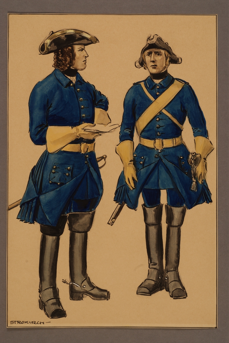 Plansch med uniform för officer och underofficer vid Västgöta kavalleriregemente tidigt 1700-tal, ritad av Einar von Strokirch.