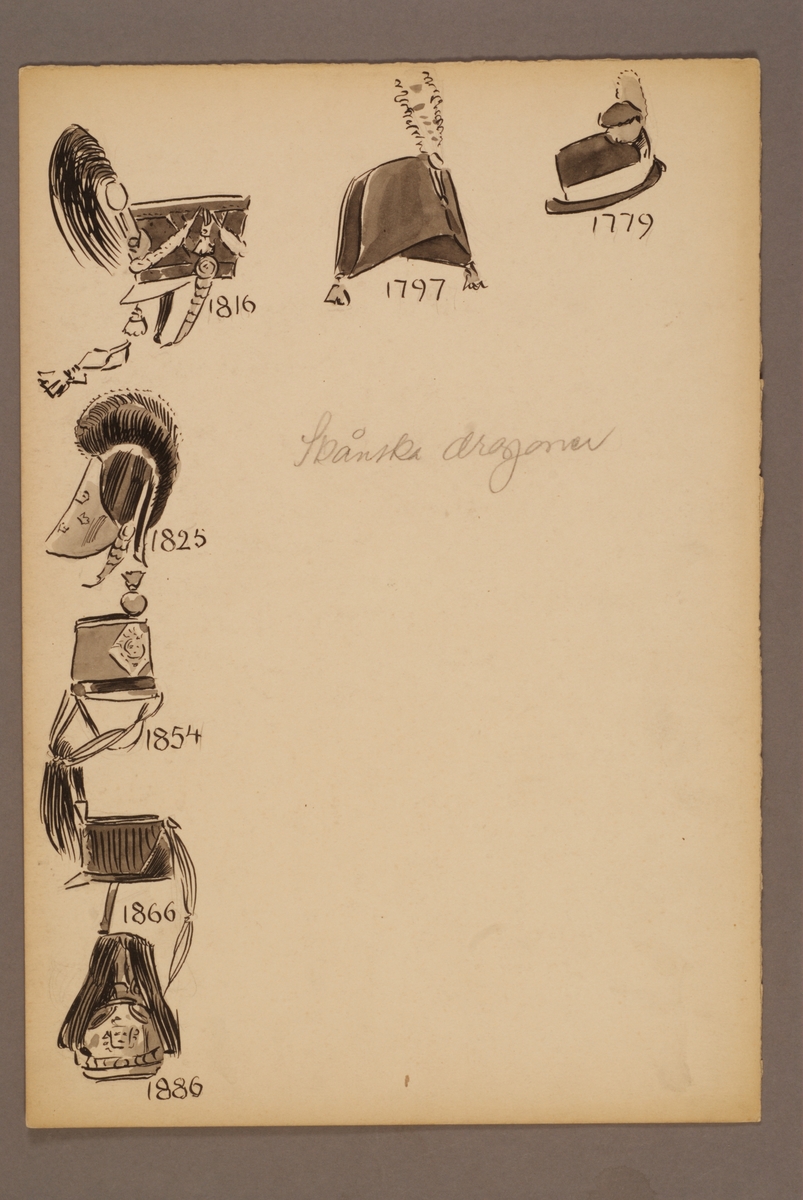 Plansch med huvudbonader för Skånska dragoner för åren 1779-1886, ritad av Einar von Strokirch.