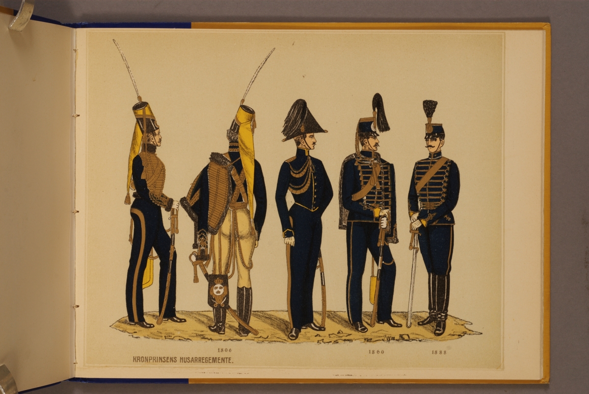 Plansch i färgtryck med uniform för Kronprinsens husarregemente för åren 1806-1888. Ingår i planschsamlingen Svenska arméns och flottans officersmunderingar utgiven av P.B Eklund.