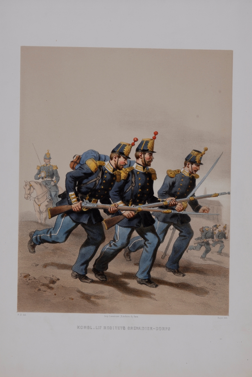 Plansch med uniform för Livregementets grenadjärkår. Plansch i färgtryck efter original av Fritz von Dardel. Ingår i planschsamlingen Den svenska och norske armeens uniformer, 1861-1863.