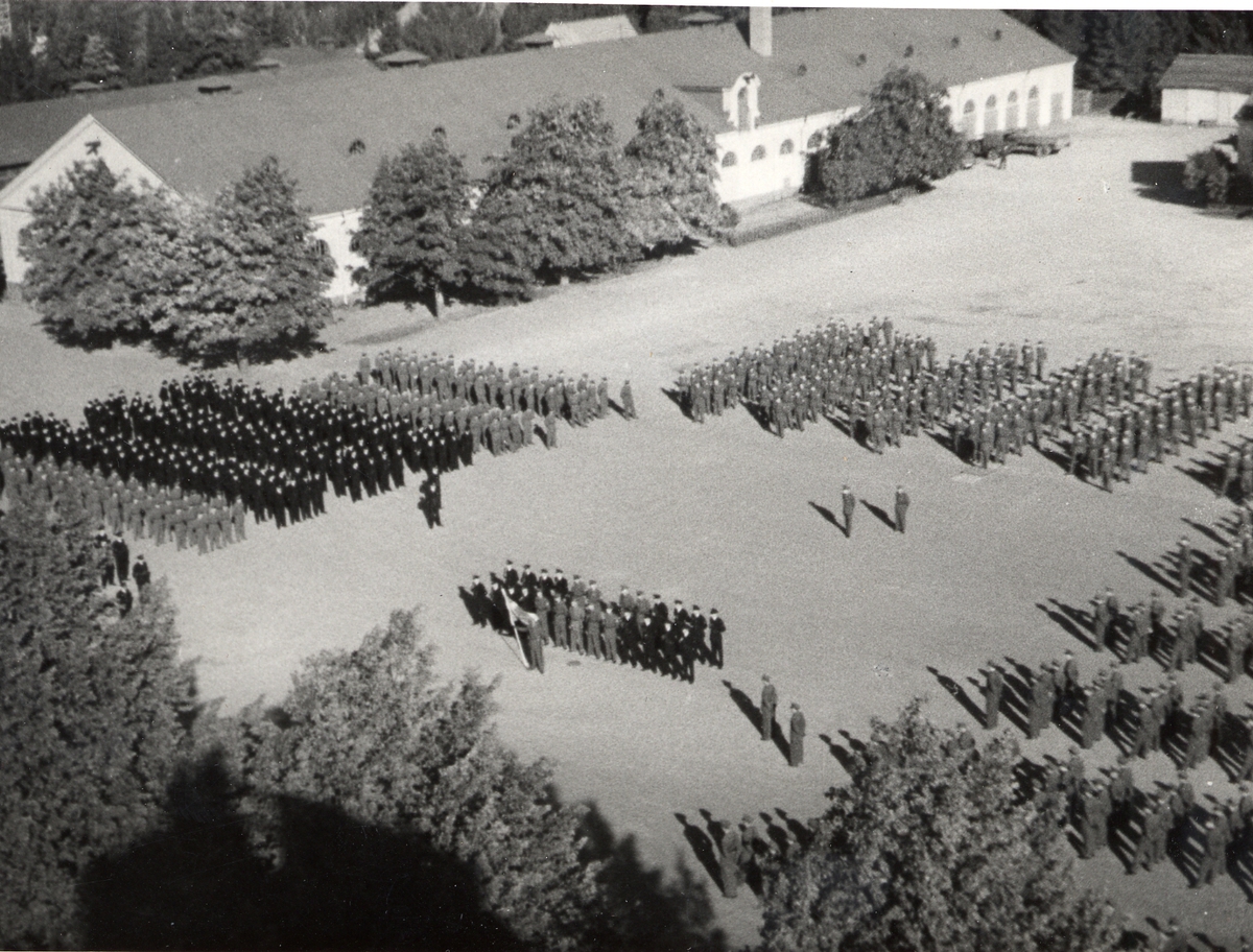 Titel: Avlämning till chefen på kaserngården vid Arméns underofficersskola (Försvarets läroverk) i Uppsala 1949.